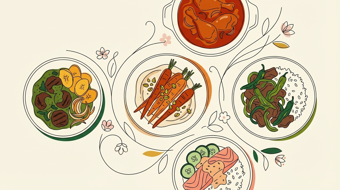 The salmon is the speedster this week — thirteen minutes, air fryer, done. The meatballs and stir-fry both land around half an hour, and the carrots need forty-five minutes of mostly hands-off roasting. The chicken paprikash is the slow one: an hour of searing, building sauce, and letting the oven finish everything over egg noodles. Spread the week across whatever energy you have each night.