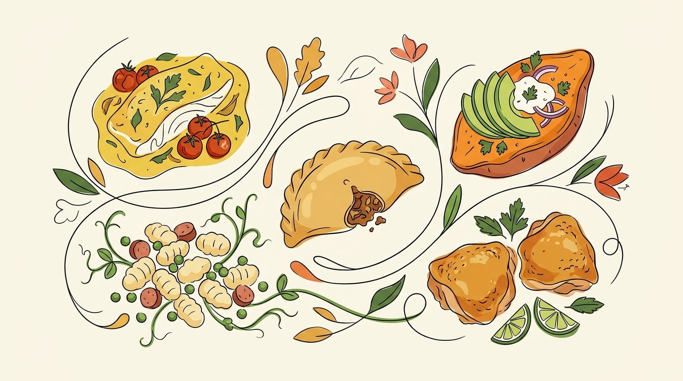 Four of the five dishes this week land between twenty-five and forty minutes — real weeknight food. The empanadas are the outlier: a full afternoon of mixing dough, simmering filling, and folding pies by hand. Save those for a Saturday when the kids want to get their hands dirty, and spread the rest across the week.